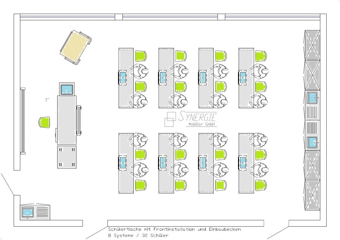 - Schülertisch mit Frontinstallation und Einbaubecken, 8 Systeme